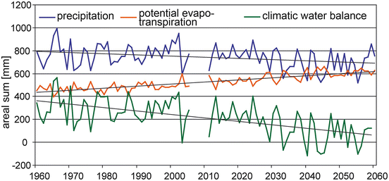 The increasing sums for potential evaporation are closely associated with the increasing temperatures (see Figs. 74.2 and 74.3 and Map 74.1 – 2a–c). During the period 1960–2005, there was an increase in the evaporation sums of 11 mm per decade. The trend calculated for the future (2011–2060) is more than twice as high, at 23 mm per decade. The highest measured value was in 2003 (598 mm). Future annual evaporation sums of up to 656 mm are even possible (see also Chaps. 53 and 58).