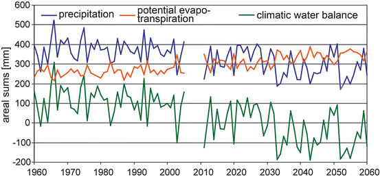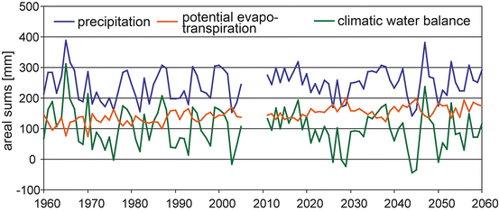 A significant decrease in the potential water available during the growing season is evident for the Upper Danube basin (see Fig. 74.3 and Map 74.1 – 3a–c). This result is the consequence of decreasing precipitation and increasing rates of evaporation. The measurement data from the past (1960–2005) indicate a decrease of 7.3 mm per decade. This trend is projected to strengthen in the period from 2011 to 2060: the average decrease reaches 45 mm per decade. The conditions in 2003 provide a glimpse of what future conditions could be like: that year, a negative water balance was reached for the first time (−4.2 mm). Figure 74.3 indicates that a water deficit with maximum of up to −116 mm may arise more frequently in the future, especially after the second third of the twenty-first century.