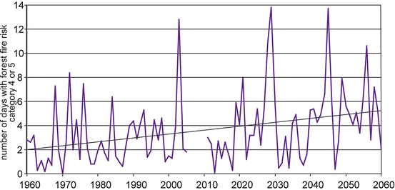 An increase in the risk of forest fires even in areas with previously low risk is seen as a likely consequence of climate warming in Central Europe (IPCC 2007). Therefore, timely planning of measures to adapt is necessary and requires the evaluation of specific hazards in affected regions. In light of the huge potential damage arising from forest fires, their precautionary prevention has great social relevance. Thus, knowledge about the regional effects of climate change on the risk of forest fires is required to protect the forested regions in the Upper Danube basin (approximately 32 % coniferous forest and 8 % deciduous and mixed forest). Extensive forested areas are mostly found in the Alpine region and the low mountain ranges (see Chap. D.3).