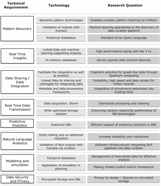 The findings after analysing the requirements and the technologies currently available show that there are a number of open research questions to be addressed in order to develop the technologies such that competitive and effective solutions can be built. The main developments are required in the fields of scalability of data analysis, pattern discovery, and real-time applications. Also required are improvements in provenance for the sharing and integration of data from the public sector.