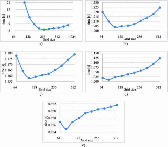 The time performance of algorithm for finding maximum distance of two points for different points distributions and different size of grid. The size of grid denotes the number of cells in one axis. The number of input points is \( 10^{7} \). Distribution of points are: (a) uniform points in ellipse, (b) uniform points in rectangle, (c) Halton points, (d) Gauss points, (e) Gauss ring points.
