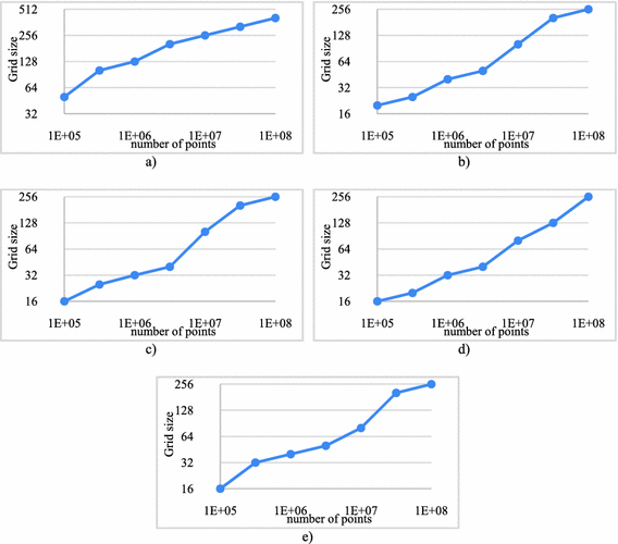 Optimal number of grid size for algorithm for finding maximum distance of two points for different points distributions and different number of points. The size of grid denotes the number of cells in one axis. Distribution of points are: (a) uniform points in ellipse, (b) uniform points in rectangle, (c) Halton points, (d) Gauss points, (e) Gauss ring points.