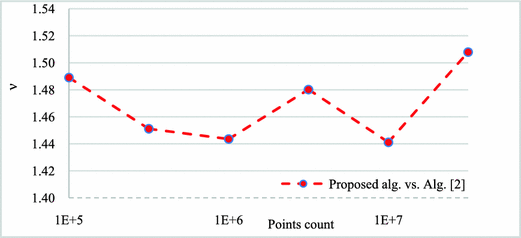 It can be seen that the speed-up of the proposed algorithm is significant with respect to BF algorithm and grows with the number of points processed. Moreover, our algorithm is in average 1.5 times faster than the algorithm in [8].