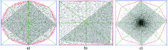 Location of AABB and initial testing polygon for \( 10^{4} \) points: (a) uniform points in ellipse, (b) uniform points in rectangle, (c) Gauss points.