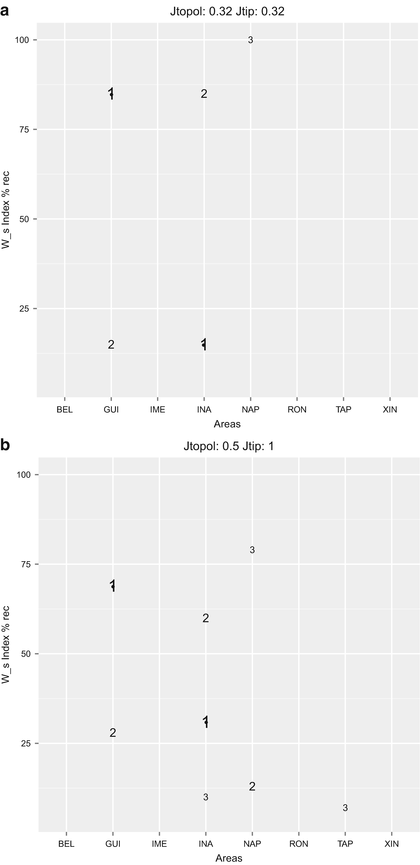 Number of times an area is recovered as the first (number 1), second (number 2), or third area (number 3). These are the lowest (a) and the highest (b) delete probabilities used in this analysis. Acronyms for areas follow Posadas et al. (2001) and table 1. (a) Probabilities of j.topol = 0.32, j.tip = 0.32 (b) Probabilities of j.topol = 0.5, j.tip = 1