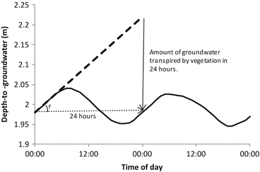 In shallow unconfined aquifers where roots of vegetation are directly accessing the water table (via the capillary zone usually), it is possible to discern the diurnal pattern of vegetation water-use in sub-daily fluctuations in the depth-to-groundwater (Gribovszki et al. 2010). Although diurnal changes in atmospheric pressure or temperature (which induce changes in water volume, evaporation and condensation) and inputs of rainfall can cause changes in groundwater depth, it is still possible to identify and sometimes quantify the extraction of groundwater through transpiration (Gribovszki et al. 2010).