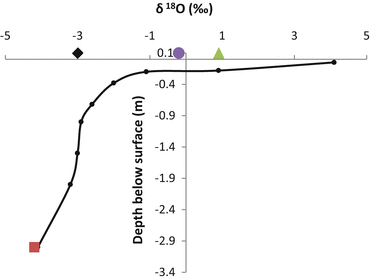 An example of the use of 18O analyses of xylem water, soil water and groundwater in a study of multiple species growing in northern Yucatan (Mexico). The 18O content of soil declines with depth through the soil profile and eventually groundwater is reached (at 3 m; brown square). The xylem 18O content of three species (Ficus spp. green triangle; Spondias spp. purple circle; and Talisia spp. black diamond) is also presented. Ficus was the least reliant on groundwater whilst Talisia was the most reliant (Redrawn from Querejeta et al. 2007)