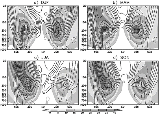 Zonal-mean zonal wind speed for the twentieth century (shaded) and change from 1980–1999 to 2080–2099 (contours), both averaged over an ensemble of climate models in (a) December, January, and February; (b) March, April, and May; (c) June, July, and August; and (d) September, October, and November. The units are m s−1. The horizontal axis is latitude, and the vertical axis is pressure in hPa. Solid contours indicate increases, and dashed contours indicate decreases. From Lorenz and DeWeaver (2007)