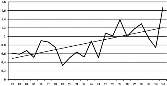 Time series of the number of turbulence accidents per million flight departures. The data are for US air carriers, covering the 22-year period from 1982 to 2003. The data for each year are connected by lines and are over-plotted with a straight line showing the linear trend. From Ballough (2007)