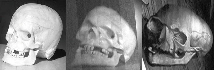 To see if optical projections may account for the appearance of this skull in the painting, we used a concave mirror of focal length 41 cm to project the image of a real skull onto a screen at a grazing angle in order to produce an anamorphic image. Figure 11.11 (Left) is a photograph of the real skull taken from precisely the location of that concave mirror after the mirror had been removed from its holder. However, because of the limited depth of focus of the projected image on the tilted screen, it was necessary to refocus the concave mirror a number of times in order to generate the composite anamorphic image that we have compressed linearly to produce Fig. 11.7 (Center).