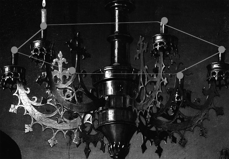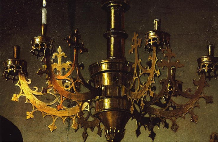 The Arnolfini Marriage (detail). As can be seen, a perspective-corrected hexagon fits the positions of the tops of the candle holders to a remarkable accuracy, with small deviations from ideal symmetry consistent with a large, hand-made fifteenth century object