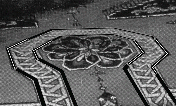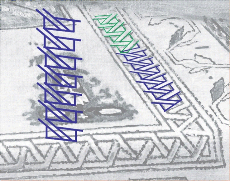 IR reflectogram of the border pattern of Fig. 11.5. Overlay at left is seven segments of a repeating structure. When corrected for perspective, this is seen to be an excellent fit to the pattern at the front of the table covering. Changing the perspective, as happens when a lens is moved to refocus, gives an excellent fit to the pattern at the back. The maximum deviation of the perfect repeating structure from the pattern on the painting is 2 mm