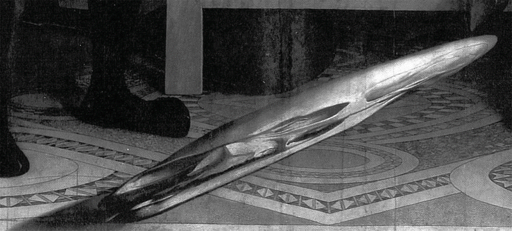 The French Ambassadors to the English Court (detail). This detail shows the unusual feature at the bottom of Holbein’s painting. Viewed from a grazing angle to visually compress it, this feature appears as shown in Fig. 11.11 (Right). Possibly not apparent in this small B&W reproduction is that this anamorphic skull does not occupy the same visual space as the rest of the painting