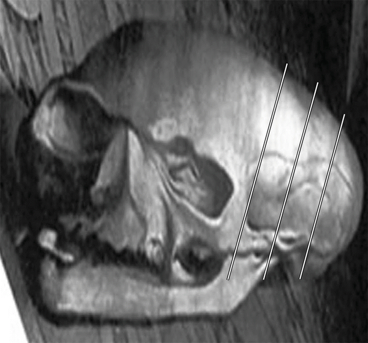 Anamorphic skull in The French Ambassadors to the English Court. For this figure we have rotated the feature in Fig. 11.10 clockwise by 25° and then linearly compressed it by 6×. The height of the skull in this image compared to a real one gives a magnification M = 0.71 ± 0.5. The lines indicate two regions where it can be seen Holbein duplicated features (notably, the two dark depressions just above the jaw, and the double-humped line midway up the skull). A discontinuity in the slope of the top of the skull is also visible at the left edge of the leftmost marked region