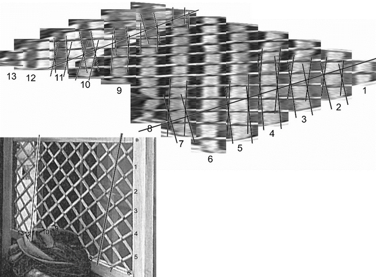 The upper right in Fig. 11.13 shows one of the two sets of slats (the set that is numbered on the lower inset), with each slat individually rotated to be vertical and expanded horizontally by a factor of 3.5× to accentuate any deviations from being straight. Marked on the slats are the locations of “kinks” exhibited by each of them, with those kinks connected by lines. The positions of the lines connecting the kinks are shown on the inset at the lower left. Comparing with Fig. 11.2 of Reference 5 it can be seen that the slats are kinked at the same two depths into the painting where we previously showed, with a different type of analysis using different data, that Campin had to refocus due to the DOF of his lens. Geometrical constructions can be devised which exhibit kinks, but not in the overall configuration of this painting. The complex perspective exhibited by the latticework in this portion of the painting is a direct and inevitable outcome from the DOF of a lens, but would be extremely unlikely to have resulted from any geometrical construction, or from the use of a straightedge.