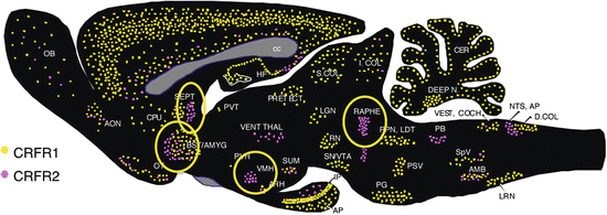 The distribution of CRFR1 (yellow) and CRFR2 (pink) mRNA expression in the rodent brain. AMYG, amygdala; BST, bed nucleus of the stria terminalis; RAPHE, raphe nucleus; SEPT, lateral septum; VMH, ventromedial hypothalamic nucleus