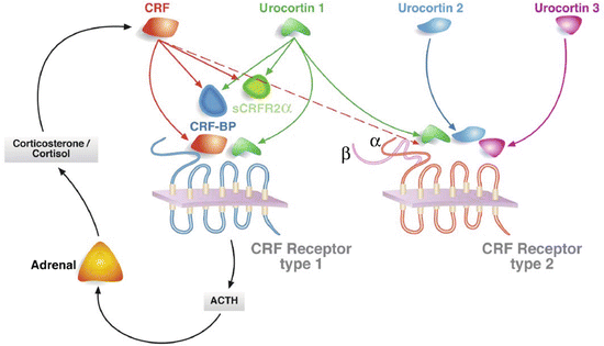 The CRF family of neuropeptides and their action on the CRFR1 and CRFR2 (Kuperman and Chen 2008, with permission). Colored arrows indicate the receptors with which each ligand preferably interacts; dashed lines indicate a lower affinity binding. CRFR2 has two apparent membrane-bound splice variants in rodents, resulting in two receptor proteins, CRFR2α and CRFR2β