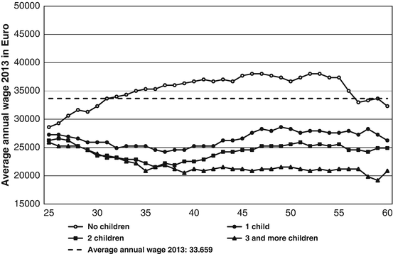Childless women, who are represented by the top line, had the highest average annual income by far. The line shows that having a steady career path is associated with increasing wages. At age 30, the earnings of childless women had reached the level of the national average income. Moreover, at around age 45, childless women were earning as much as the average man (Fachinger and Himmelreicher 2008). Mothers with one child, whose labour market participation levels were not much lower than those of childless women, nonetheless saw their wages decline between the ages of 25 and 40, and increase slightly at later ages. They never came close to having the average income, which is represented by the dotted line. The income trajectories of mothers with two children were similar to those of mothers with one child, but their wages were lower. The steady decline in their income stopped at age 35, and their wages increased from that point onwards. Mothers with two children reached their highest earnings level, of about 60 % of the national average income, between ages 50 and 55. Mothers with three or more children had a distinct income path. Their income declined steadily until they reached age 40, and then remained at a low level of around half of the national average income. This suggests that the relatively small number of mothers with three or more children who were working were mainly in low-income jobs or part-time employment (Fig. 16.4).
