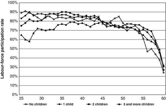 Figure 16.1 shows that some of the women had already reached retirement age at the time of the SHARE interview. For the others, the calculation of the participation rate is shown until the actual age is reached. The four lines represent women with zero, one, two, or three or more children. The lines differ greatly by age. At ages 25–45, the employment participation rate is around 75 % among childless women, and is around 60 % among women with one child. However, among women with two or more children the pattern is more irregular: their labour market participation rate declines until they reach their mid-thirties, and increases gradually there-after. At age 35, only about 30 % of the women with two children and 20 % of the women with three or more children are working.