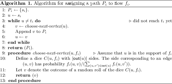 Our main result is a randomized approximation algorithm for path computation and function placement with the following guarantee. Let m denote the number of links in the substrate network, \(\varepsilon \) denote a parameter such that \(0< \varepsilon <1\), and \(\mathsf {opt}^*\) denote the maximum benefit that can be attained by a fractional solution (one in which requests may be partly served and flow may be split along multiple paths). Let \(c_{\min }\) denote the minimum edge capacity, let \(d_{\max }\) denote the maximum demand, and let \(b_{\max }\) denote the maximum benefit of a request. Let \(\varDelta _{\max }\) denote an upper bound on the number of processing stages a request undergoes. If \(c_{\min }/(\varDelta _{\max }\cdot d_{\max })=\varOmega ((\log m)/\varepsilon ^2)\), then with probability at least \(1-\frac{1}{m}-\textit{exp}(-\varOmega (\varepsilon ^2\cdot \mathsf {opt}^*/(b_{\max }\cdot d_{\max })))\), the algorithm computes a \((1-\varepsilon )\)-approximate solution.