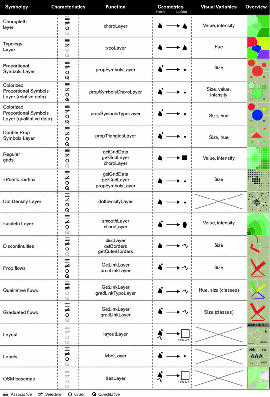 The package design follows some of the current practices in GIS workflows. Each function has two main arguments: a spatial object (e.g., GIS: vector layer/R: sp object) and an attribute table (e.g., GIS: csv/R: data frame). Each function focuses on a single cartographic representation (e.g., proportional symbols or choropleth representation) displayed on a georeferenced plot. This solution handles each representation as a layer and allows overlaying multiple representations on a map.