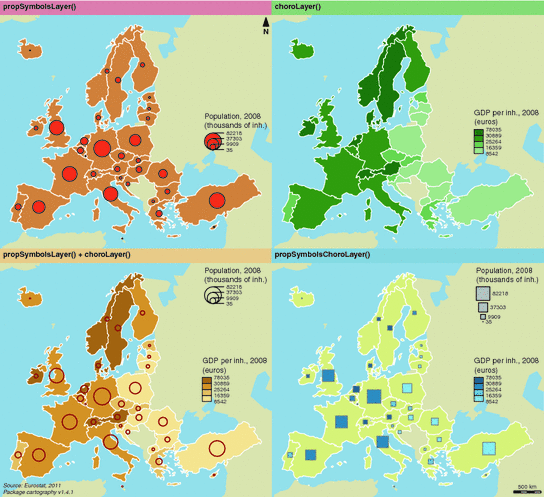 The third and fourth maps combine two indicators. Symbol sizes are proportional to the amount of population and color scales are based on the distribution of gross domestic product per inhabitant ( propSymbolsChoroLayer, propSymbolsLayer + choroLayer ).