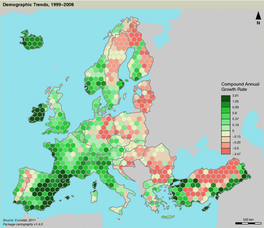 Following the common practice in R package development, each function in cartography is illustrated by a full example. Examples use datasets provided in the package (spatial and statistical datasets on European regions) and new users can easily reproduce them or adapt these scripts to their own data. A large range of export formats are available, in both vector and raster files, allowing final edition a graphic design software if needed (Giraud and Lambert 2016).