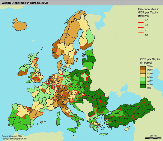 Discontinuity maps are based on the variation of a phenomenon in contiguous administrative units. This kind of representation does not focus on homogeneous regions, but rather on spatial breaks. Here, the thickness of the borders points out discontinuities intensities.