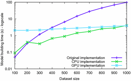 Model building times for different dataset sizes. 2x Xeon E7-4820@2.00 GHz, NVidia Tesla K20c