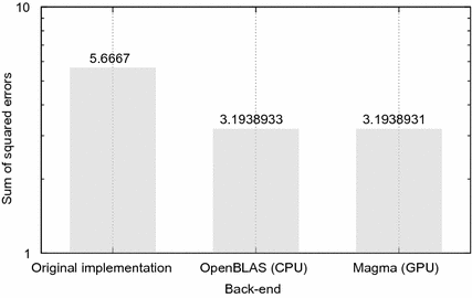 Direct BLAS calls from Armadillo would normally be handled by OpenBLAS, in this case the nvBLAS library [9] provided by NVidia has been leveraged in order to offload the operation to a GPU when available. nvBLAS intercepts standard BLAS calls and, when available, performs the operation on the GPU using the cuBLAS implementation from NVidia. The use of nvBLAS allowed us to leverage the GPU for what concern the BLAS operations, while keeping Armadillo code unchanged.