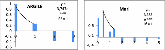 The auto-correlation function in the vertical direction of EM was determined for clay and marl. The best results were obtained with the exponential function (Figs. 9 and 10) for which the value of R2 is the highest.
