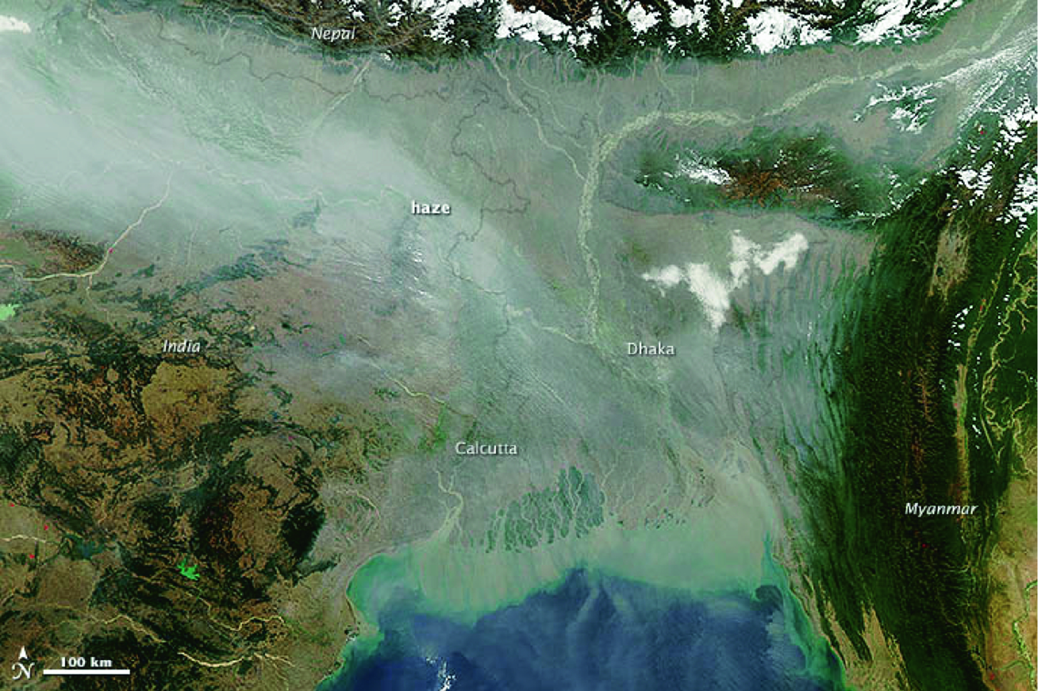 Winter haze blanketing the entire IGP, including regions of Pakistan, India, Nepal, and Bangladesh, south of the Himalaya (right)