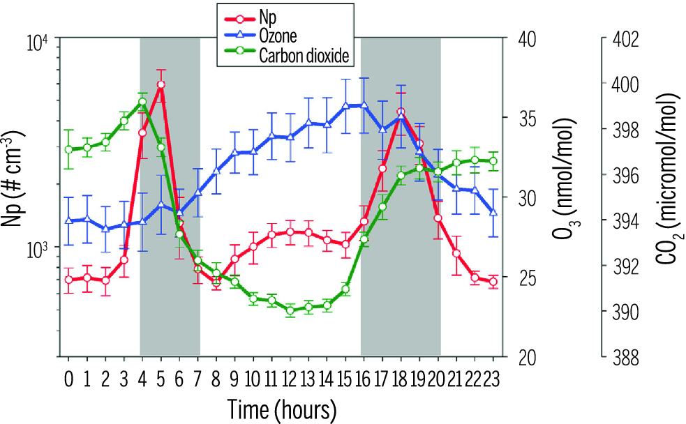Diurnal variations for aerosol particle number concentration (Np), surface O3, and CO2 at Askole in northern Pakistan (3,015 m asl)