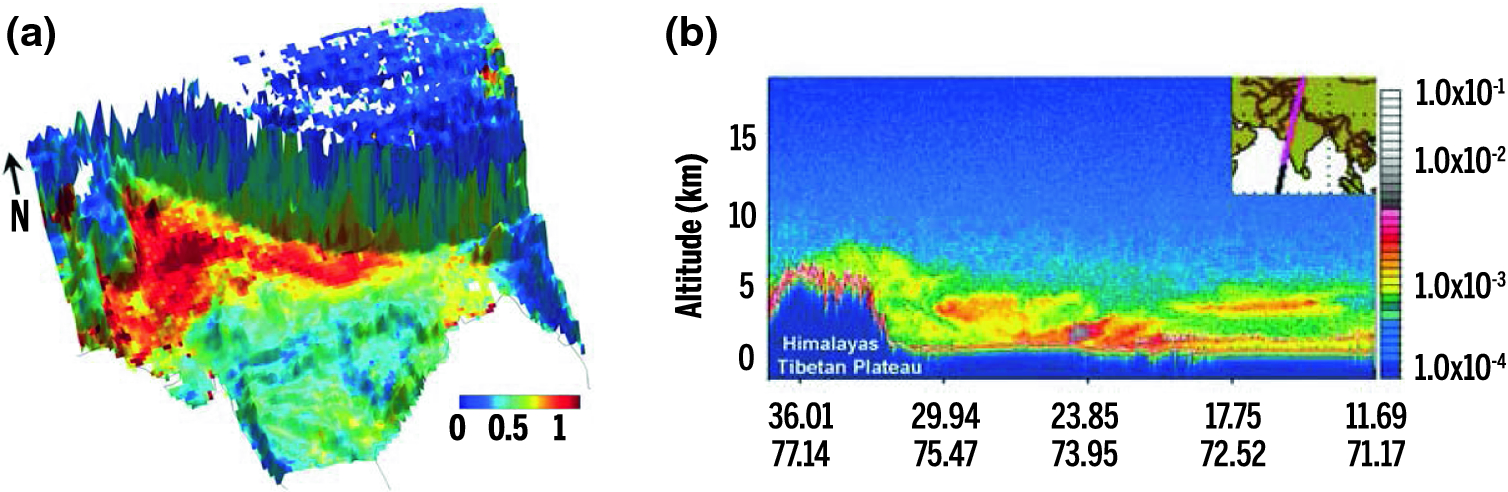 Mean MODIS AOD during pre-monsoon season between 2003 and 2006, projected as a function of surface topography (left) and CALIPSO back-scatter profile from southern India to the Himalaya (right)