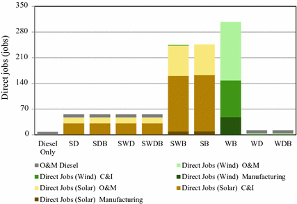 Direct jobs created in Manufacturing, C&I, and O&M for all scenarios