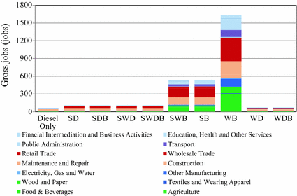 In some scenarios battery storage is added to balance RE supply fluctuations, while the already installed diesel generator served as the conventional backup system. Techno-economic simulation parameters and the energy flow strategy used in the model are adopted from Bertheau et al. [16]. Input technical and economic data for the mini-grid components are provided by ILF BERATENDE INGENIEURE GmbH. An appliance utilization and daily power consumption analysis for 10 energy demand clusters was conducted in the region. The results obtained during this process are used in a Monte-Carlo time-of-use simulation to determine the annual hourly electricity demand profile. Annual hourly solar radiation used is derived from NREL and wind speed data are obtained from the Global Wind Atlas [17, 18]. Adiabatic terrain index in Counihan was used to adjust the wind speeds obtained according to the terrain surface roughness of the area [19]. The calculations for adjusted wind speeds of a typical semi-urban terrain type are shown in Mayr [20]. The methodology applied in Bertheau et al. is used to calculate the LCOE for all scenarios at 15% weighted average cost of capital (WACC). The LCOE gives the cost-optimized system configurations for a project period of 20 years. The system sizing results from urbs are used to compute the employment impacts for all scenarios. Replacement and degradation costs are considered to be of negligible effect. Also, system stability simulations are not conducted in this exercise. The direct jobs created are calculated applying the EF methodology in Rutovitz et al. [21]. The country’s productivity level obtained from KILM [22] is used to adjust the EF for the region in estimating the direct jobs created locally. The backward-linkage jobs (gross jobs) created in different industries in the region are calculated using the Leontief IO model [23]. The regional IO table required for the IO model is built applying [24, 25, 26].