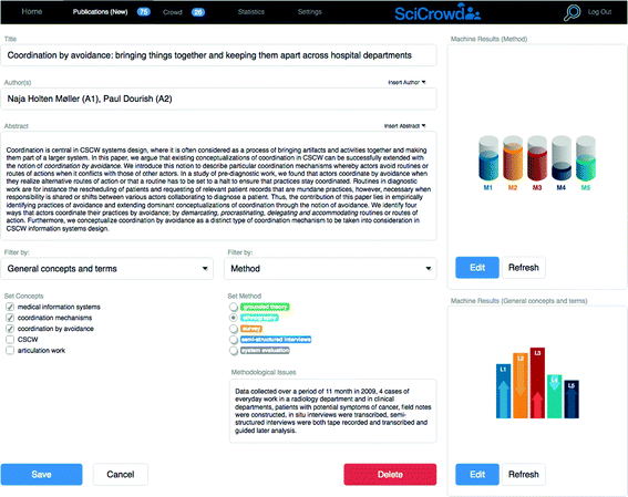 In this work, SciCrowd is introduced as a crowd-powered system prototype under development “from the ground up” towards an open participation model in which a large amount of researchers and crowd workers/volunteers can contribute for improving the way as research data are processed. We assume that crowd-computing hybrids constitute a valuable instrument to address some of the limitations of current applications by enabling us to identify new relations between research topics, authors, and groups [10]. Meaningful categories, filters, and summaries can be generated through mixed-initiative approaches combining human and machine intelligence [13]. Such synergies between mechanical and cognitive operators (the “crowd”) can contribute to create open knowledge bases supported by collaborative participation.