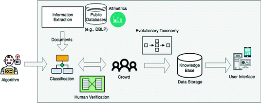 Research tasks such as performing a systematic literature review involve a set of laborious, time-consuming, and sometimes wasteful efforts. This includes the identification of relevant sources, data extraction, and quality assessment [5]. In this scenario, relevant sources and data dimensions can be ignored during the process. Thus, suitable crowd-powered systems are required to produce, share, filter, and combine scientific discoveries. In the literature, crowdsourcing has been closely related to processes, task characteristics, and participants [10]. Tinati and colleagues [7] identified numerous factors when designing citizen science platforms, including task specificity, community development, task design, and engagement. The authors pointed out to the likelihood of using periodic feedback, roles and privileges, and task context as motivational factors. In addition, the environment must be easy to use, fast, intuitive, and reliable. Crowd aspects (including size, type, social structure, behavior), quality control, and temporal issues (e.g., daily devoted time) assume particular importance on the design of crowd-powered systems [10]. Hybrid classifiers must be trained according to the crowd behavior and the system must enable the crowd to selectively supplement weak regions of the classifier [16].