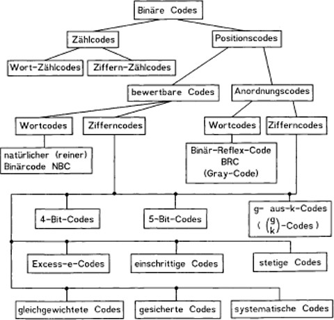 Es gibt keinen optimalen Allzweckcode. Die Wahl eines geeigneten binären Codes wird wesentlich durch die Forderungen bestimmt, die sich aus den Eigenschaften des Datenverarbeitungssystems ergeben. Ein Code für arithmetische Operationen hat beispielsweise anders auszusehen als einer für Übertragungsoperationen auf Leitungen oder ein Code zur digitalen Meßwerterfassung von mechanischen Großen. Bild 10. 1 zeigt eine schematische Übersicht über die wichtigsten Codes. Die Schematisierung ist insofern unvollständig, als eine Reihe von Codes gemeinsame Eigenschaften besitzen, die dieses Schema nicht zum Ausdruck bringt.