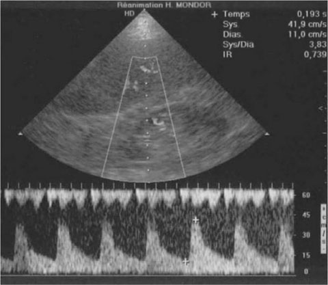Renal sonography is performed routinely to assess renal and collecting system morphology. B-mode sonography provides valuable information on anatomic features including kidney size (longitudinal diameter and parenchyma thickness) and appearance (kidney margins and echogenicity of the parenchyma, cortex, medulla, and papillae); presence and degree of hydronephrosis; and presence of stones, calcification, cysts, or solid masses. However, B-mode sonography does not evaluate kidney function. Renal Doppler, in contrast, helps to assess renal perfusion and renal function of native or transplanted kidneys (Fig. 1). Renal Doppler is valuable for assessing large arterial or venous abnormalities and has been suggested for evaluating changes in intrarenal perfusion due to diseases of the renal parenchyma [1, 2, 3, 4, 5]. The Doppler-based renal resistive index is a recently suggested tool for assessing changes in renal perfusion in critically ill patients [6, 7, 8] and for predicting acute kidney injury (AKI) in patients with severe sepsis [9]. However, many factors influence the renal resistive index and should be taken into account when interpreting resistive index values in critically ill patients [10].