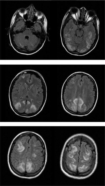 Cerebral magnetic resonance imaging in a patient with posterior reversible encephalopathy syndrome (PRES). Fluid-attenuated inversion recovery (FLAIR) sequence showing bilateral high-signal foci in the cerebellum, basal ganglia, and occipital, parietal, frontal, and temporal lobes