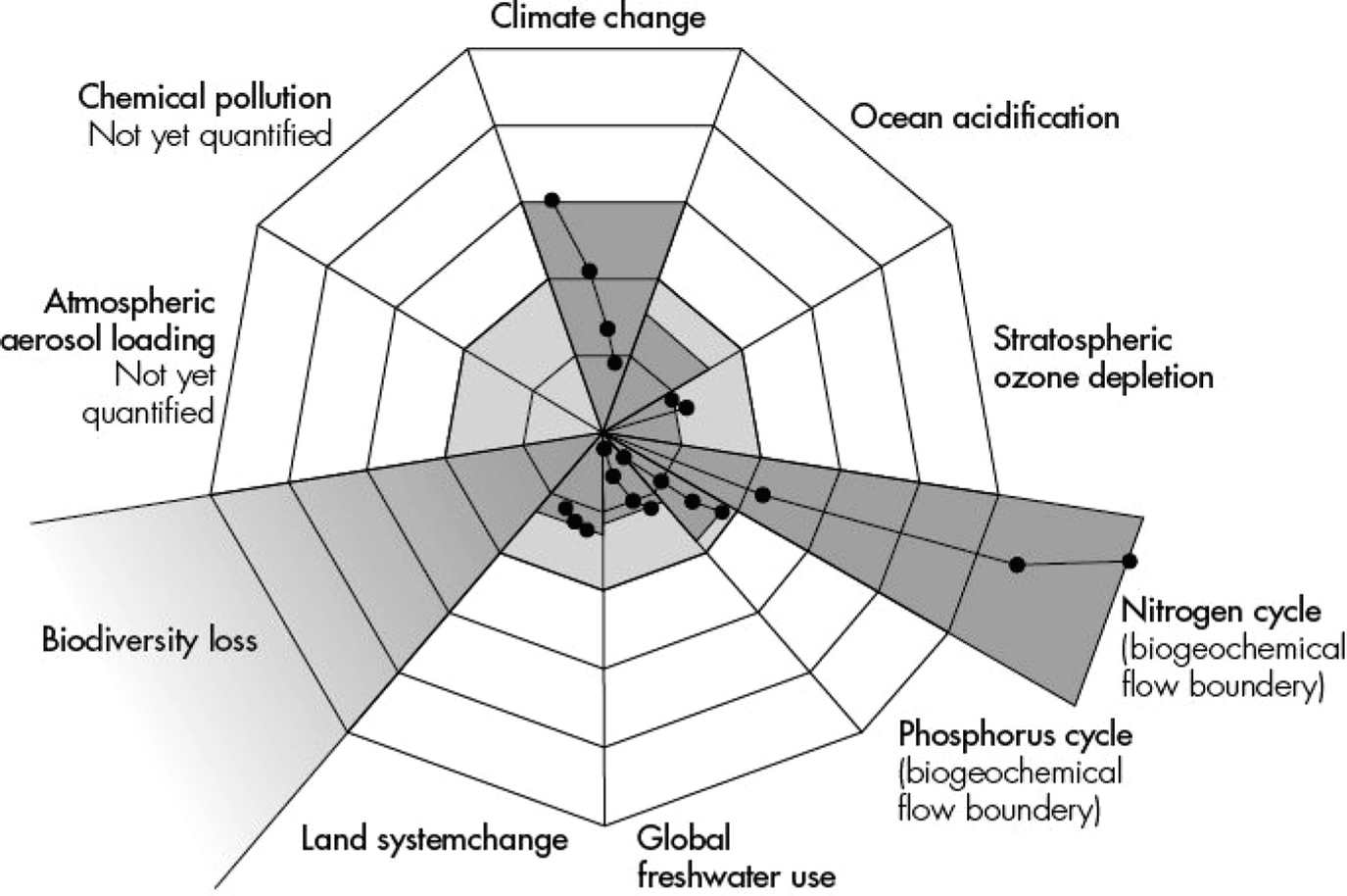 The work on planetary boundaries has identified seven plus two ‘boundaries’ (see Fig. 5.1) among which is the earth system science rationale for the two-degree target as one of the boundaries.