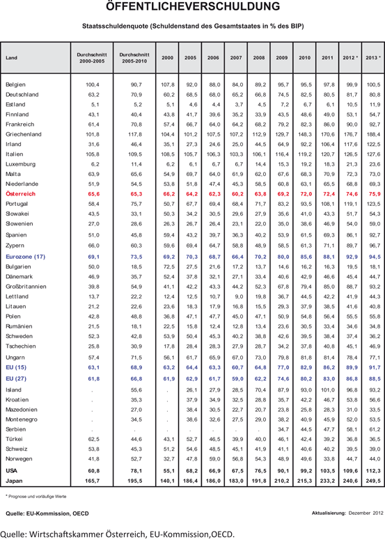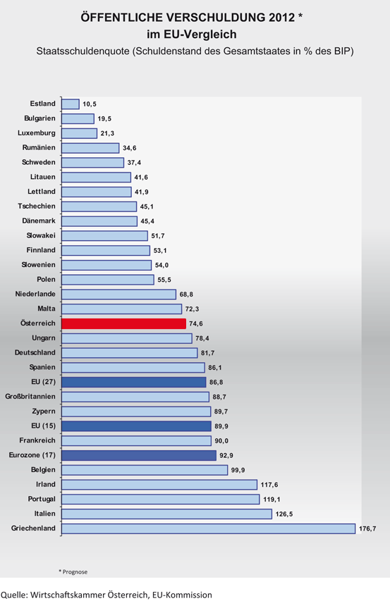 - Wirtschaftskammer Österreich, Öffentliche Verschuldung, unter Bezugnahme auf Daten der EU-Kommission und der OECD (http://wko.at/statistik/eu/europa-verschuldung.pdf), Aktualisierung Dezember 2012
