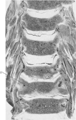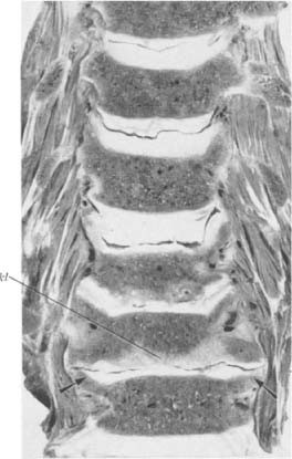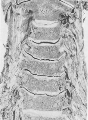 Halswirbelsäule eines 89jährigen Mannes. Obere drei Bandscheiben gut erhalten. Bei der vierten Bandscheibe erkennen wir die schräg nach außen gekippten Processus uncinati, die infolge der hohen statischen Beanspruchung samt ihrem Gegenpol in symmetrischer Weise stark sklerosiert sind (Pfeile). Die Wirbelkörperendplatten sind sonst frei von Sklerosierung