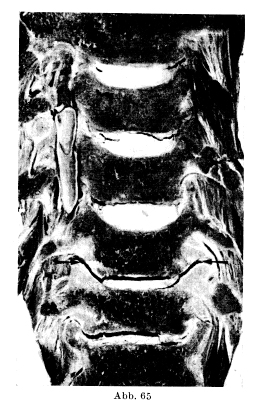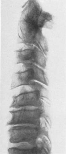 Seitliches Röntgenbild der Halswirbelsäule in Abb. 66. Infolge der Ausbiegung der Processus uncinati können sich die Wirbelkörper bis zur Berührung nähern. Sie sind wie Quader zu einer Säule übereinander gestellt. Die Zeichen der Osteochondrose und die ventralen Randzacken sind ausgeprägt. In den unteren Segmenten besteht eine Kyphose. (74jähriger Mann)