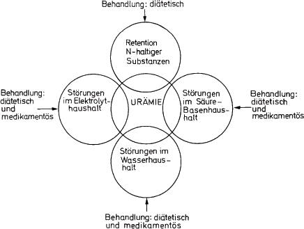 Das klinische Bild der Urämie wird in erster Linie durch die mehr oder weniger eingeschränkte renale Elimination stickstoffhaltiger Substanzen und durch das Ausmaß pathologischer Verschiebungen im Elektrolyt-, Säure-Basen- und Flüssigkeitshaushalt bestimmt. Da die Zufuhr von Eiweiß bzw. stickstoffhaltigen Substanzen diätetisch auf ein Minimum reduziert und ein Bilanzdefizit bzw. -überschuß an Wasser und in der Nahrung enthaltenen Elektrolyten (Natrium, Kalium) durch forcierte diätetische Zufuhr- oder Restriktion kompensiert werden kann, ist es verständlich, daß durch eine richtige Diät nicht nur die blutchemischen Befunde sondern auch die klinischen Symptome wesentlich gebessert werden können. Somit nimmt die Diät eine zentrale Stellung in der symptomatischen Behandlung der Niereninsuffizienz ein. Nach Beseitigung zusätzlicher extrarenaler Komponenten, wie Auffüllen eines eingeengten Extrazellulärraumes, kardiale Rekompensation, Absetzen eines Reststickstoffsteigernden Medikamentes (z. B. Tetrazykline u. a.), ist die Diätetik sogar die einzige, wirksame therapeutische Maßnahme, den Reststickstoff bzw. Harnstoff Stickstoff (BUN) im Blut zu senken (Abb. 1).