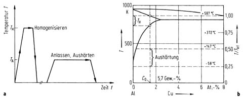 Temperatur-Zeit-Diagramm der Wrmebehandlung einer ausscheidungshrtbaren Legierung; b Zustandsdiagramm Al–Cu mit Temperaturbereichen fr Wrmebehandlung. Fr eine Legierung der Zusammensetzung C 0 = 1,5 At.-%Cu ist das Verhltnis T/T kf = a eingetragen worden. Fr diese Legierung gilt: 0,8 < a < 1:Homogenisieren, 0,3 < a < 0,6: Aushrtung durch Ausscheidung von nm-Teilchen, a < 0,3: thermisch aktivierte Prozesse zu langsam, bersttigter Mischkristall