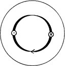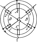 wechselnden Kraftlinienflufs, dessen Achse im Räume feststeht und in der Figur senkrecht von unten nach oben den Eotor durchdringt. Die Polmitte ist dabei konstant bei A und C und die neutrale Zone bei B und D. Es ist schwer einzusehen, dafs durch ein solches Wechselfeld ein Drehmoment zustande kommt, und dafs die Eichtung des Drehmomentes durch den willkürlich gewählten, ursprünglichen Drehsinn bestimmt ist.