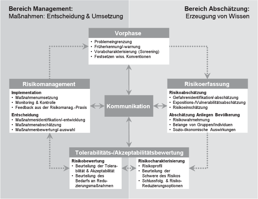 Um die komplexen und hoch vernetzten Klimarisiken besser abschätzen und handhaben zu können, hat der Internationale Risikorat (IRGC) 2005 ein Konzept für eine in sich schlüssige Risikoregulierungskette entworfen. Klimarisiken sind nicht naturwissenschaftlich determiniert, sie ergeben sich immer aus dem Wechselspiel zwischen menschlichem Verhalten und natürlichen Reaktionen. An dieser Schnittstelle zwischen Technik, Organisation und Verhalten setzt das IRGC-Modell an (Renn 2011). Das vierstufige Verfahren umfasst alle wesentlichen Aspekte eines effektiven und gegenüber öffentlichen Anliegen sensiblen Umgangs mit Risiken. Ziel der IRGC-Veröffentlichung war zum einen, die oft verwirrenden Begriffe bei der Erforschung und Regulierung von Risiken in ein konsistentes terminologisches Gerüst zu bringen. Zum anderen will das Konzept ein Evaluierungsinstrument für good governance sein, also für einen vollständigen, effektiven, effizienten und sozialverträglichen Umgang mit Risiken (IRGC 2005).