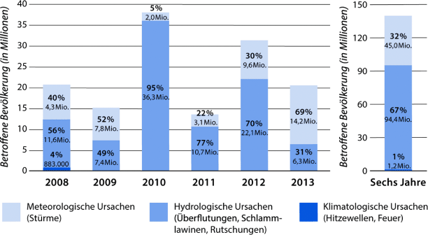 Umweltkatastrophen als Auslöser: Kurzfristig eintretende Extremwetterereignisse wie Stürme und Überflutungen sind häufig mit großen Bevölkerungsbewegungen verbunden. Diese bleiben aber weit überwiegend kleinräumig (Foresight 2011; Bohra-Mishra et al. 2014; IPCC 2014). Hauptgrund sind häufig geringe Möglichkeiten der Betroffenen für weiträumigere Migration sowie die Rückkehrmöglichkeiten. Internationale humanitäre Hilfe ist ein wichtiger Faktor, der Menschen ein Überleben in der Nähe ihrer Heimatorte ermöglicht, gleichzeitig aber weiträumige und permanente Umsiedlung weniger wahrscheinlich macht.